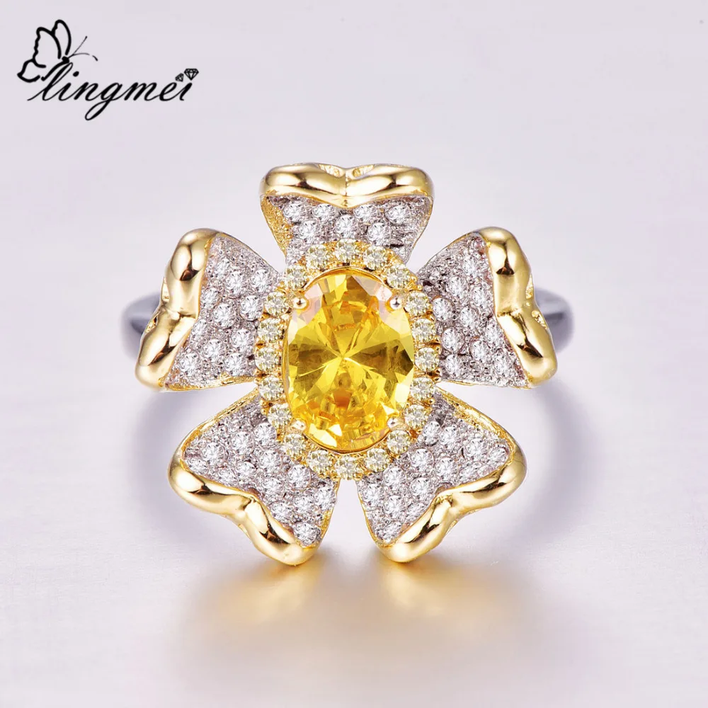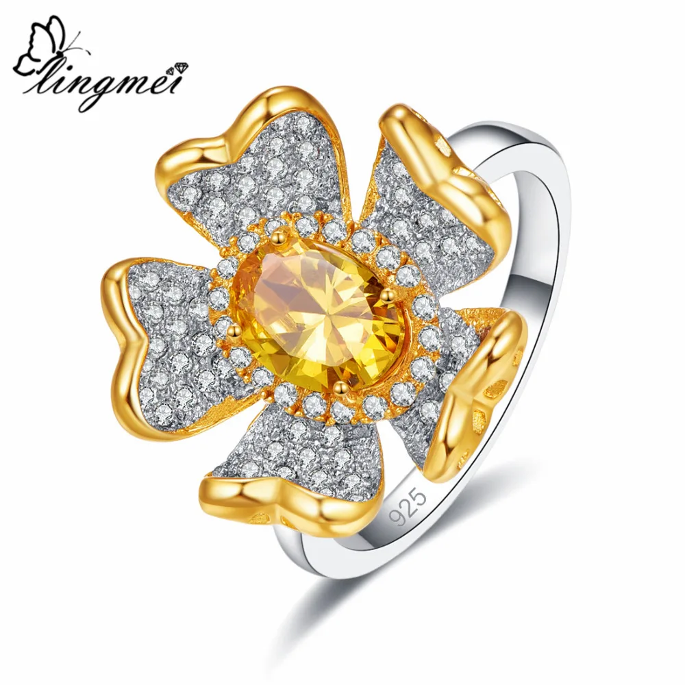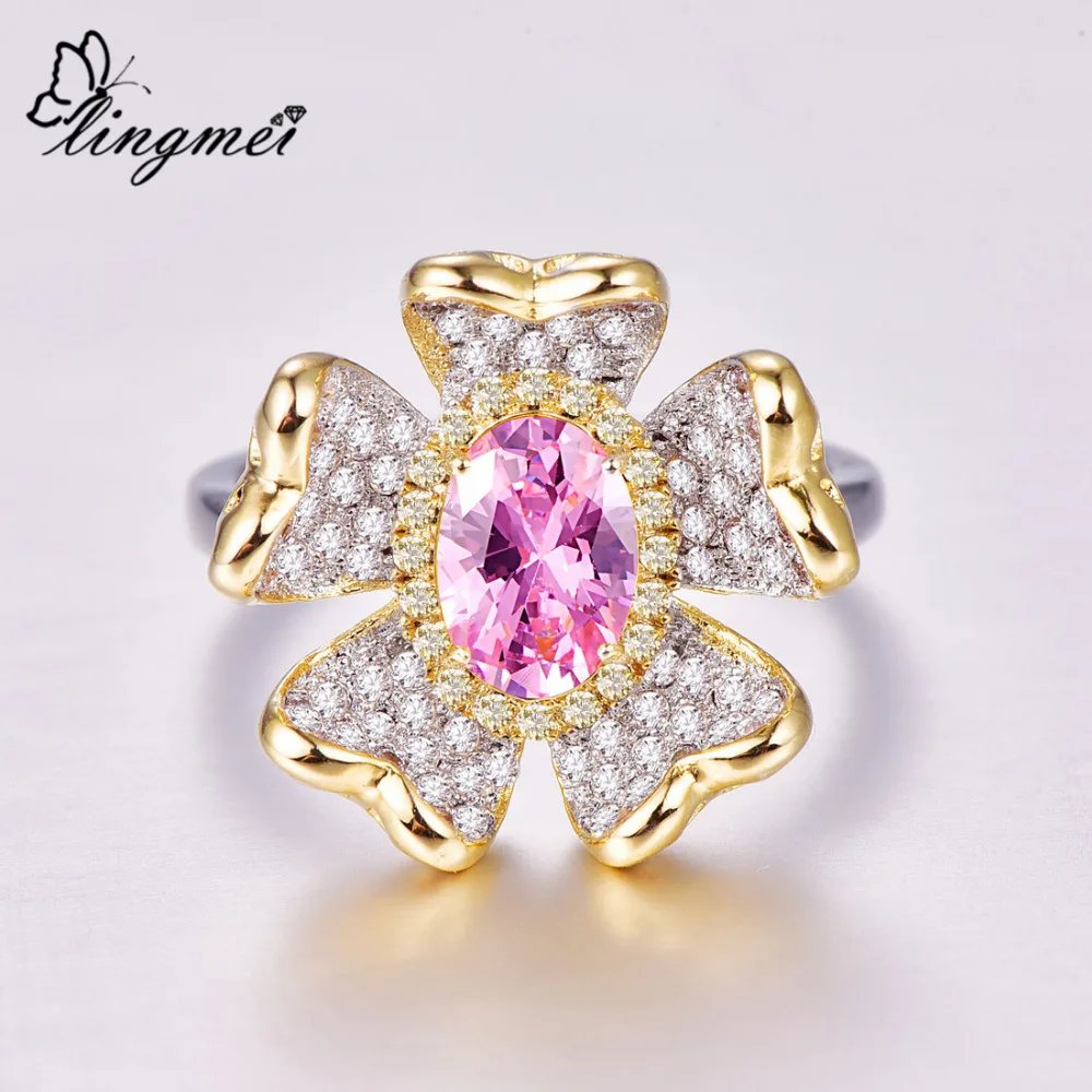 Best Lingmei 2019 Flower Fashion Women Jewelry Oval Pink & Gold & White Zircon Silver Ring Size 6 7 8 9