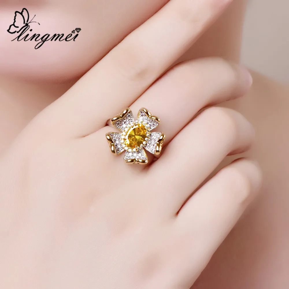 Promo Lingmei 2019 Flower Fashion Women Jewelry Oval Pink & Gold & White Zircon Silver Ring Size 6 7 8 9