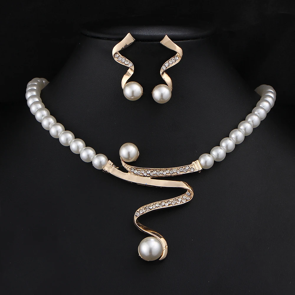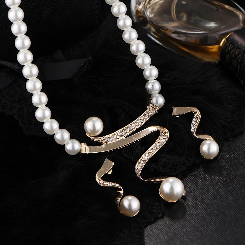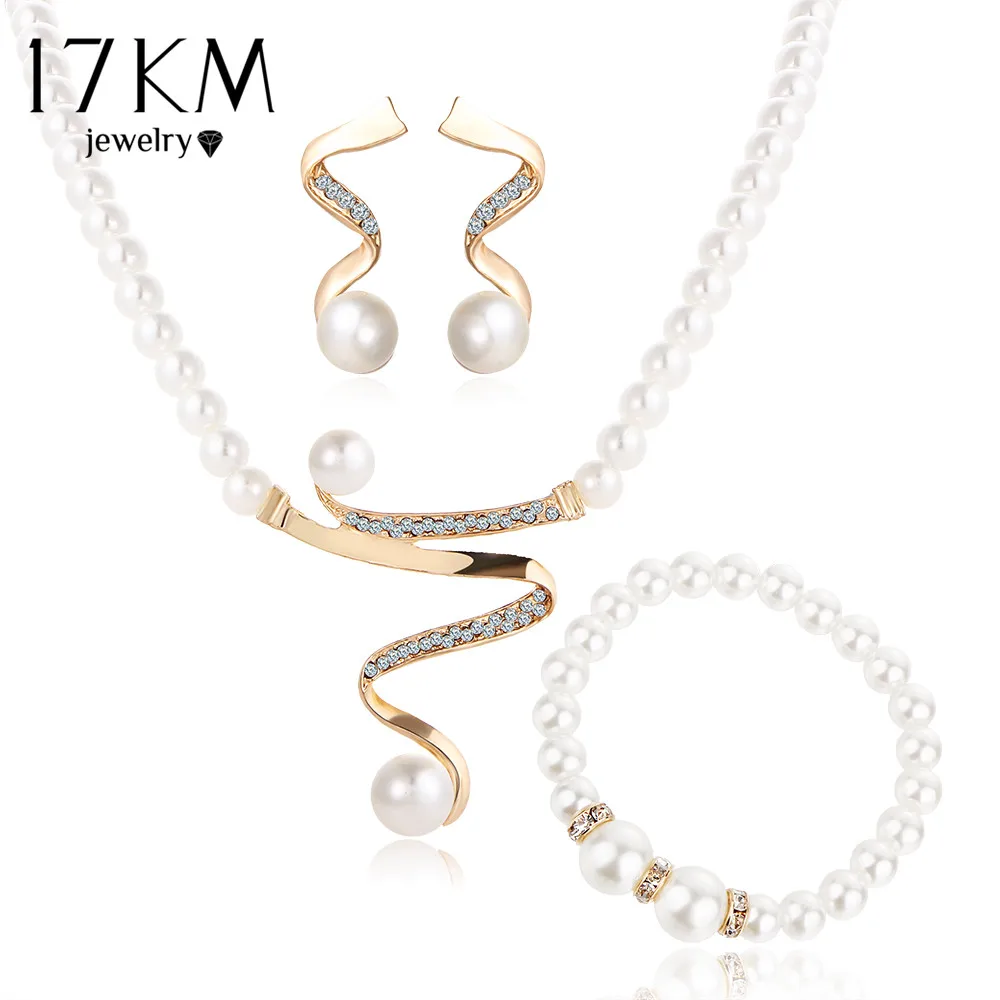 New 17KM Vintage Simulated Pearl Jewelry Sets For Women Wedding Bridal Crystal Necklace Earrings Gold C