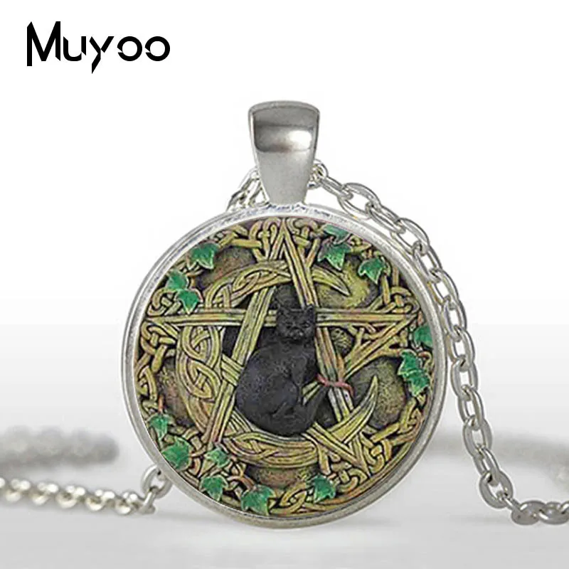 Promo Vintage Glass Dome Pendant Black Wicca Pendant Necklace Magical Pentagram Wiccan Black Cat Jewelry